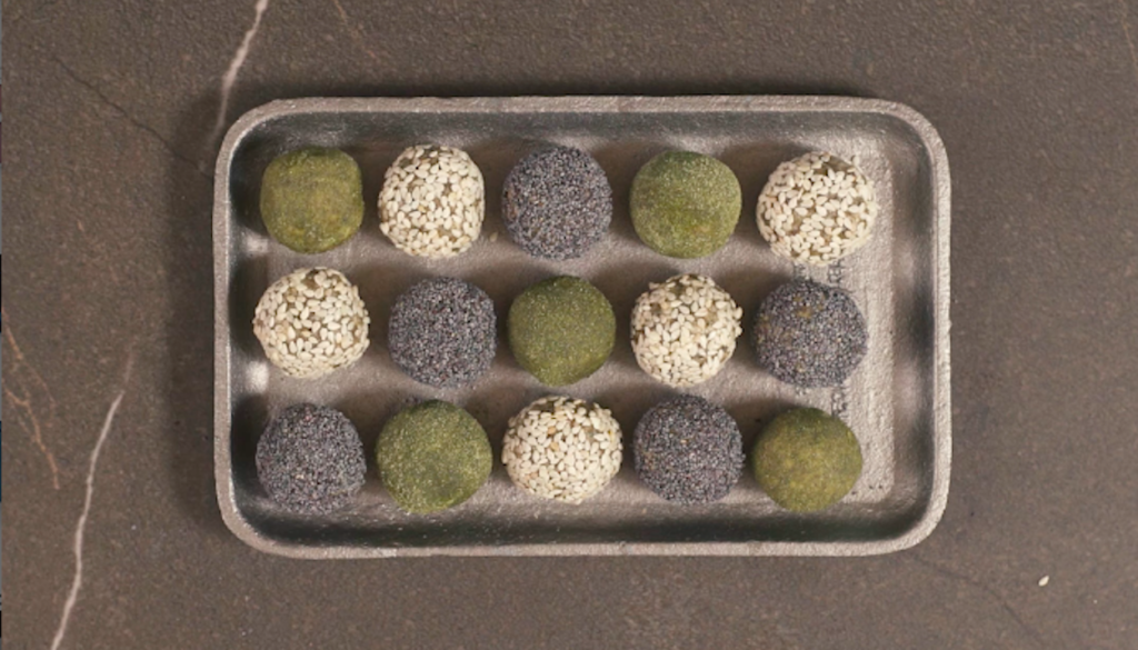 – Decora le praline ripassandole nella polvere di tè matcha, nei semi di sesamo e nei semi di papavero.