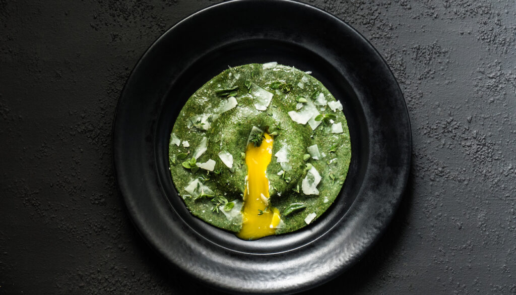 RAVIOLONE VERDE CON UOVO FONDENTE ED ERBE AROMATICHE